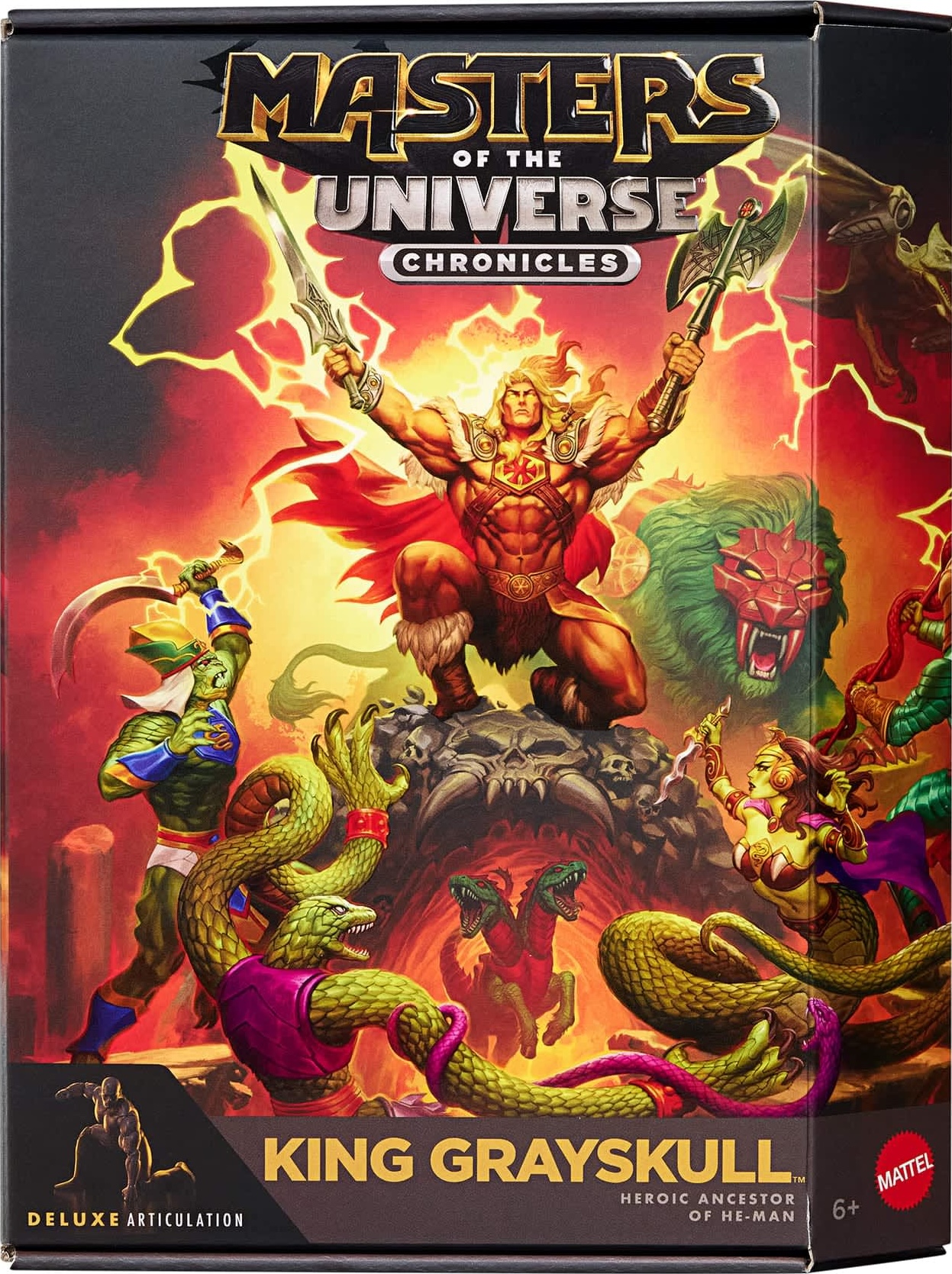 This King Grayskull toy was added on April 2026 and also released in 2026 with a retail price of $30.00. It may be harder to find this action figure as it's an exclusive to Creations. This action figure is part of the Masters of the Universe genre within the Mattel Chronicles series. This toy currently has no recent price history so it's not possible to determine the worth. This toy is not found in any user collections. However, this figure was recently added, so it will take some time for collectors to add to their collections.